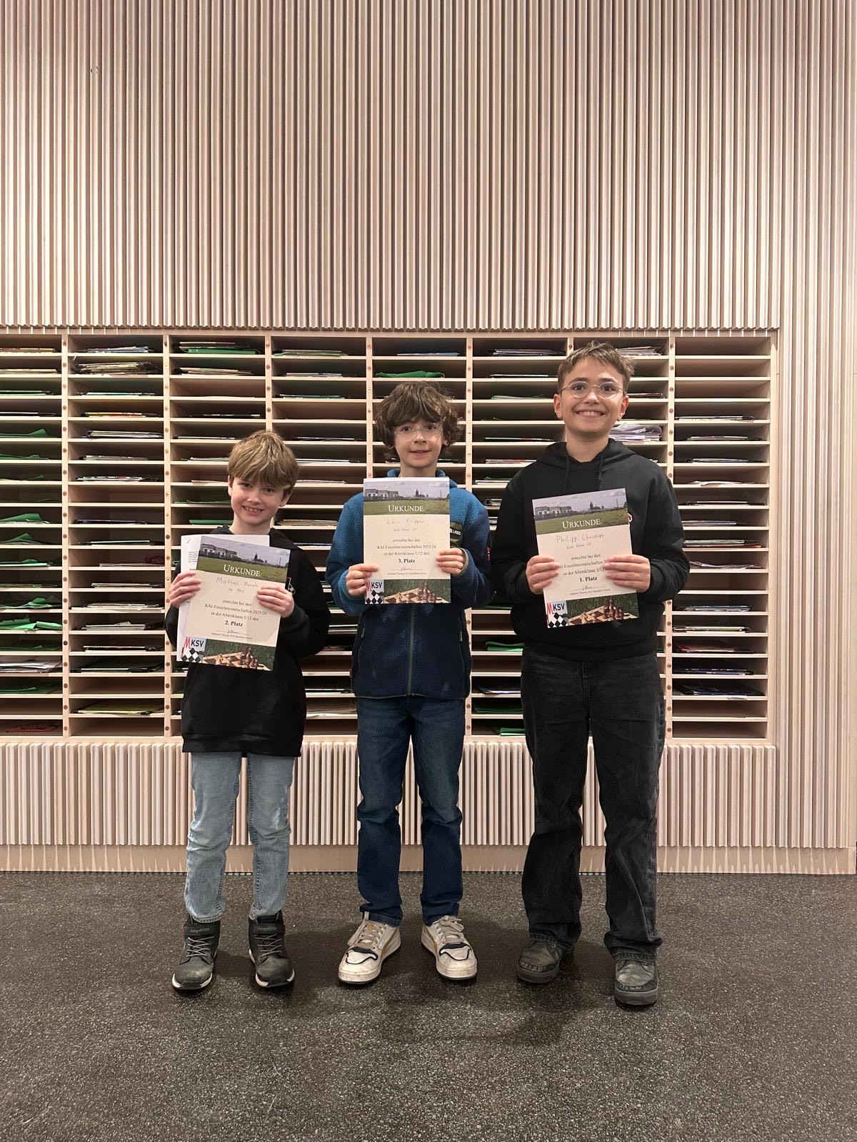 Die U12 war mit 25 Teilnehmern in diesem Jahr knapp vor der U10 (24) die größte Altersklasse. Im Laufe des Turniers gab es einige überraschende Performances und eine ungewöhnlich lange Partie in der letzten Runde (mit deren siegreicher Beendung sich Javier Aragon noch auf Platz 5 vorschob). Am Ende schaffte es sogar ein eigentlicher U10er auf Platz 2, der wie Platz 1 und 3 in diesem Jahr mit einer Urkunde geehrt wurde!